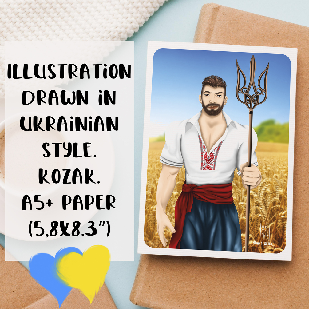 The illustration is drawn in Ukrainian style. Kozak
