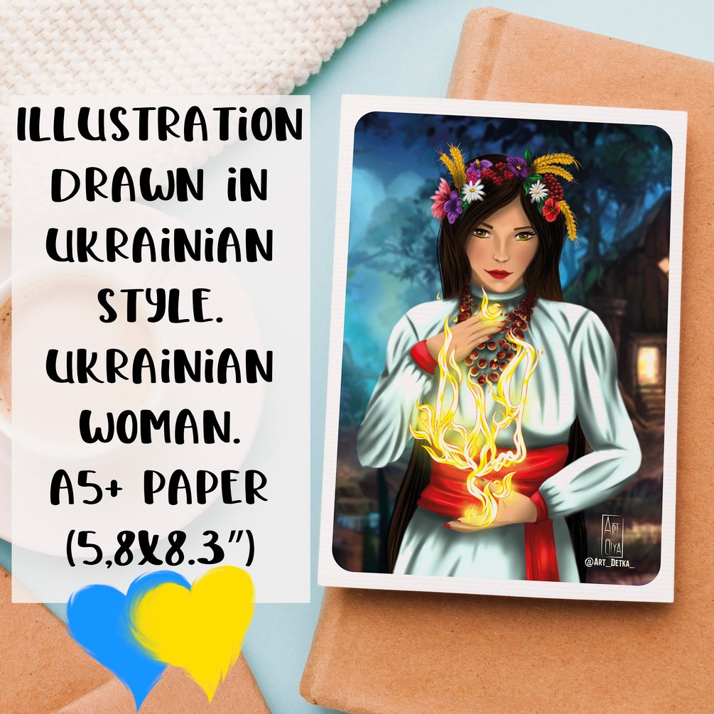 The illustration is drawn in Ukrainian style. Woman